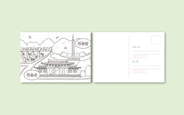 호국원을 대표하는 장소들을 단순 일러스트로 표현하여 제작한 컬러링 엽서이다.