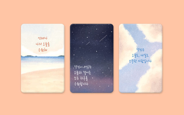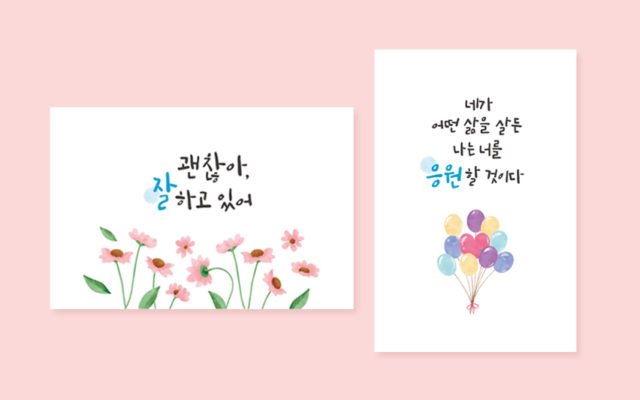 위로와 응원을 주는 문구에 맞추어 부드러우면서 힘 있는 캘리그라피를 제작했다. 갤리그라피와 어울리는 감성적인 일러스트를 제작하여 전체적으로 따뜻한 느낌을 준다.