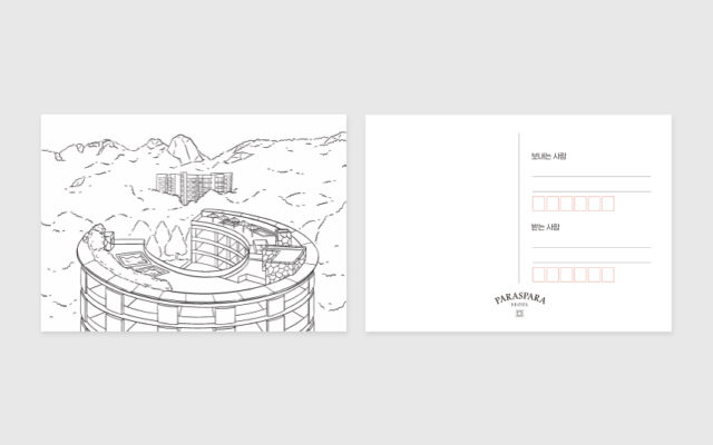 파라스파라 호텔 전경을 라인 일러스트로 그려 넣은 컬러링 엽서이다.