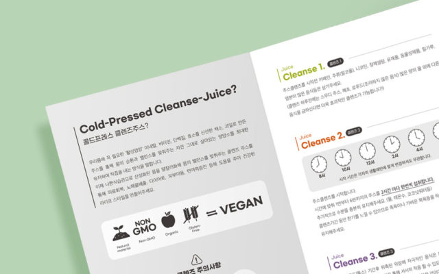 주스클렌즈 디톡스에 대한 설명이 담긴 리플렛으로, 한 눈에 보기 쉽게 깔끔하게 제작하였고 주스 컬러로 포인트를 주어 제작했다.