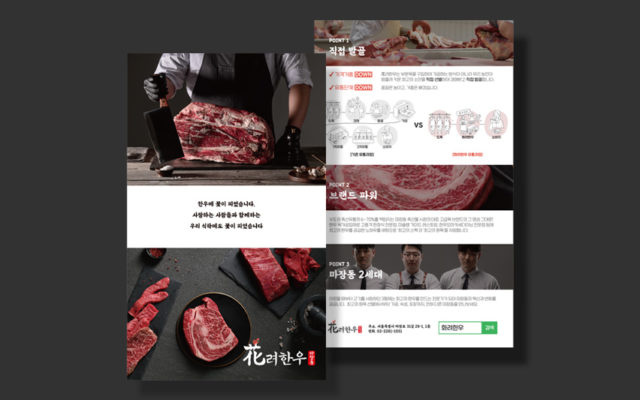 앞면은 한우 이미지와 시그니처 문구로 깔끔하게 제작하였으며 뒷면은 브랜드의 소개로 구성 되었다 일러스