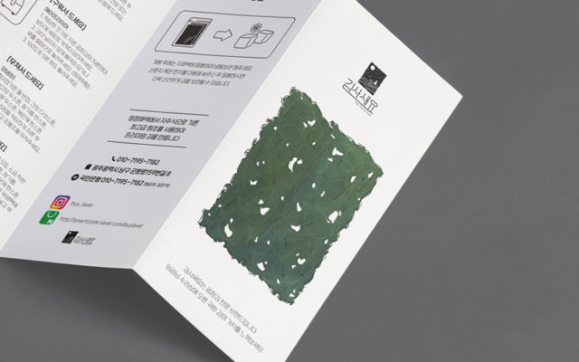 김에 대한 설명이 담긴 리플렛으로, 귀여운 김 원물 일러스트를 표지에 넣어 포인트를 주었다.