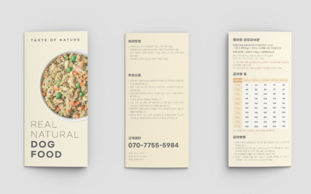 강아지 화식에 대한 정보가 담겨있는 리플렛. 차분하고 깔끔하게 제작되었다.