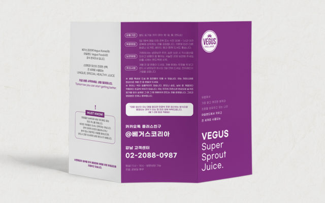 베거스코리아의 브랜드 상품 소개 3단 리플렛. 포인트 컬러를 활용하여 제작되었다.