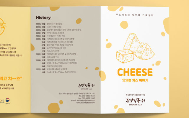 리플렛의 주제에 맞게 치즈 구멍 일러스트를 배경으로, 전체적으로 심플하게 제작하였다.