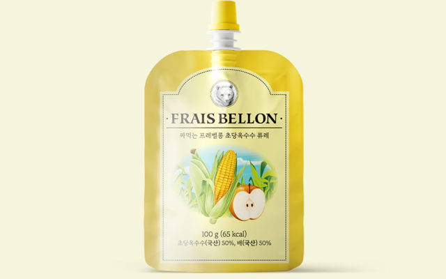 프레벨롱의 옥수수배퓨레 파우치형 패키지 디자인입니다.