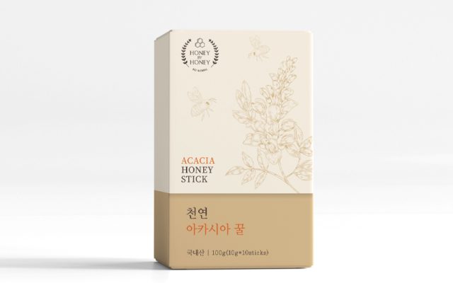 벌과 아카시아 꽃 일러스트가 포인트로 들어간 꿀 패키지이다. 묘사가 잘 된 일러스트와 컬러 선정으로 고급스럽고 깔끔하게 제작됐다.