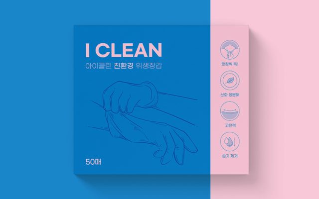 기존의 틀에 박힌 위생장갑 컬러에서 벗어나 트랜디한 컬러로 제작한 패키지이다. 아이콘으로 위생장갑의