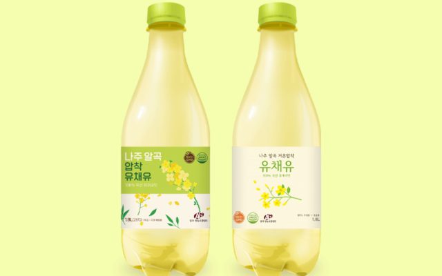 유채꽃 일러스트가 포인트로 들어간 유채유 라벨 디자인이다. 유채꽃에 톤을 맞추어 노랑, 연두 컬러로