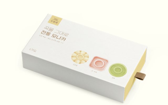 설을 맞이해 제작된 전통 과자 선물세트 패키지이다. 검정콩, 팥·수수, 완두 모나카 일러스트와 브랜드 컬러를 최소한으로 포인트로 넣은 심플한 패키지이다.