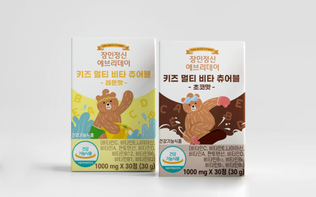 키즈 멀티 비타 츄어블 패키지이다. 섭취 대상이 어린이인만큼 즐겁게 섭취할 수 있도록