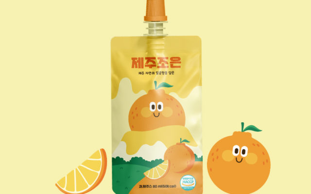 어린이용 제주 한라봉 과채주스 패키지로, 전체적으로 한라봉을 떠올리는 컬러와