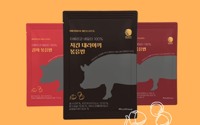 김치, 마라, 데리야끼를 나타내는 기본 컬러에 옐로우 컬러가 포인트로 들어간 패키지이다. 투명창을 돼지 이미지로 하고 도토리 원물 일러스트를 넣어 이베리코 돼지고기가 들어간 볶음밥임 표현하였다.