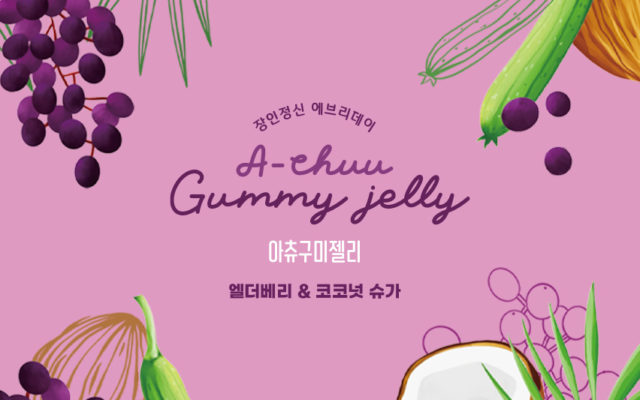 원재료 일러스트들을 이용한 아츄구미젤리 라벨이다. 주 재료인 얼더베리 컬러를 바탕으로 귀엽고 통통 튀게 제작하였다.