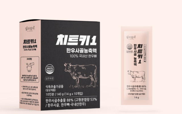 블랙색상과 살구색으로 고급스러우면서 깔끔하게 표현한 패키지이다. 소 일러스트를 넣어 한우사골의 식품을 한눈에 알아볼 수 있도록 제작하였다.