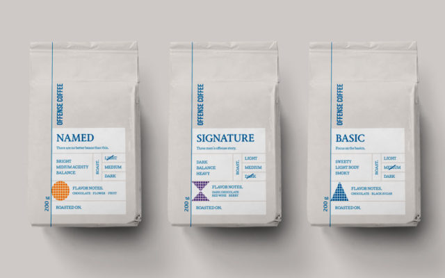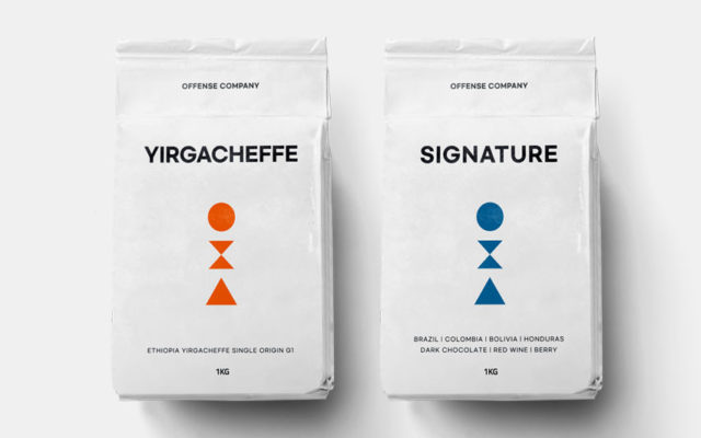 오펜스컴퍼니의 1kg 커피 원두 2종. 로고 형태를 이용하여 제작되었다.