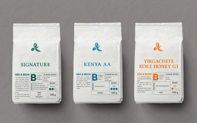 빅컴퍼니의 커피 원두 브랜드 biig & bean. 총 3종으로 출시되었으며 텍스트 중심으로 심플하게 제작되었다.