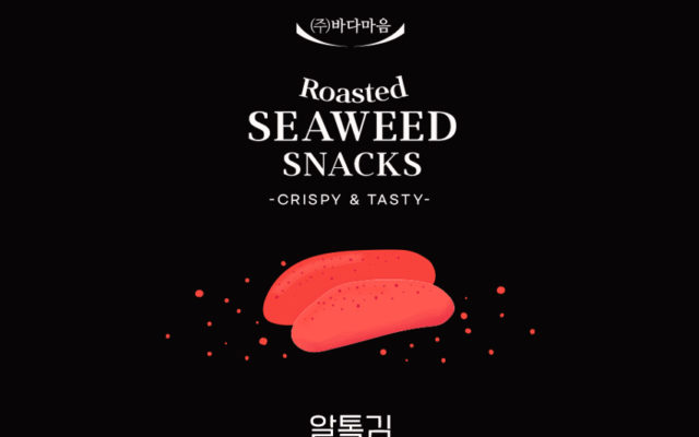 수산물 가공, 제조 브랜드 바다 마음. 블랙 바탕에 빨간 명란 원물 일러스트를 포인트로 넣은 알 톡 김 패키지로, 명란의 알들이 주위에 톡톡 튀어진 일러스트가 귀여움을 더하고 있다.