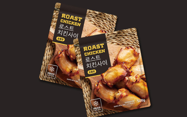 숯불향 로스트 치킨 패키지로, 거친 텍스쳐의 영문 서체와 톤 다운된 브라운과 옐로우 컬러 조합으로