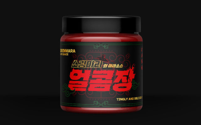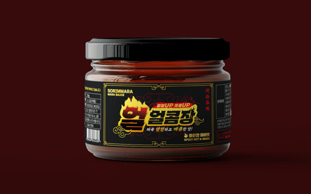 불에 타오르는 듯한 효과를 준 타이틀을 중심으로 매콤하고 강렬함이 느껴지는 마라 소스 라벨이다.