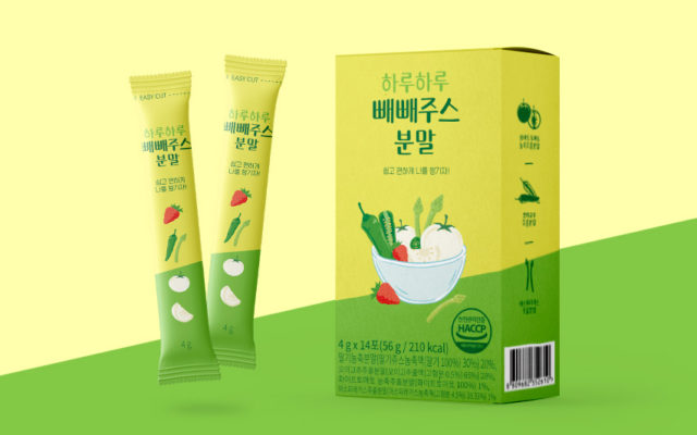 원재료를 일러스트화하여 어떤 재료가 들어갔는지 한번에 확인 할 수 있으며 사선 배색 배경으로 초록계열을 사용하여 원재료의 신선함을 보여 주는 패키지이다.