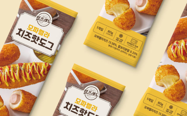 제품 이미지에 프레임 타이틀의 조화로 이미지와 그래픽이 잘 녹아든 패키지로 고급스럽고 레트로가 가미되어 누구나 좋아할 수 있는 핫도그 패키지이다