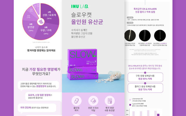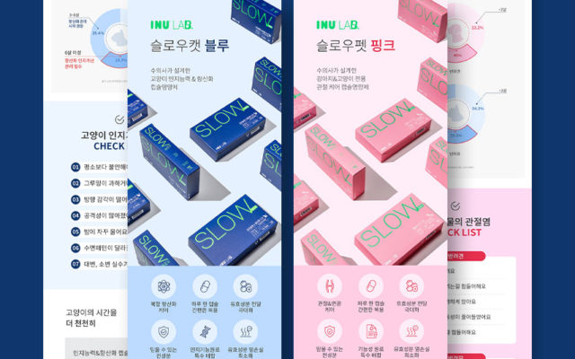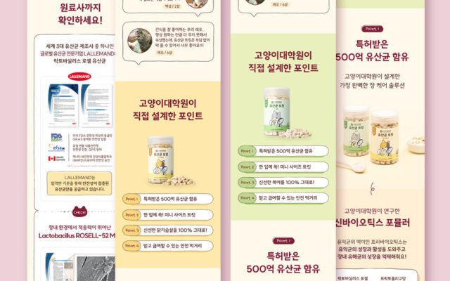 강아지, 고양이 전용 관절 케어 영양제와 고양이 전용 인지능력, 향산화 영양제 상세페이지이다.