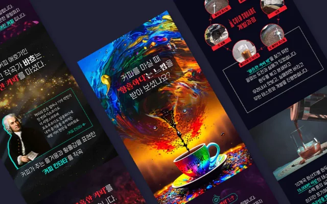 배경에 어두운색을 사용하여 컬러풀한 느낌이 더 두드러 지도록 하였으며