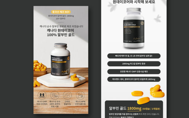 제품 패키지의 색상으로 상세페이지 메인 컬러를 사용하였으며 이미지위주로 주목성을 주었고 고딕체를 이용해 가독성을 높인 상세페이지이다.