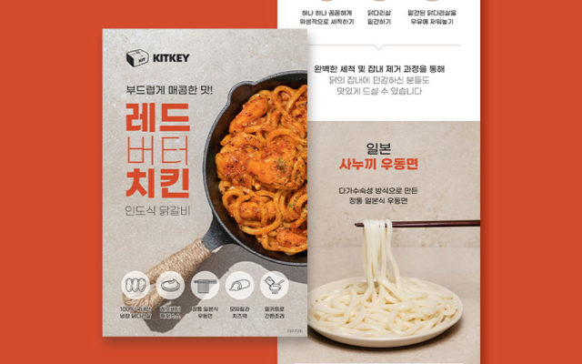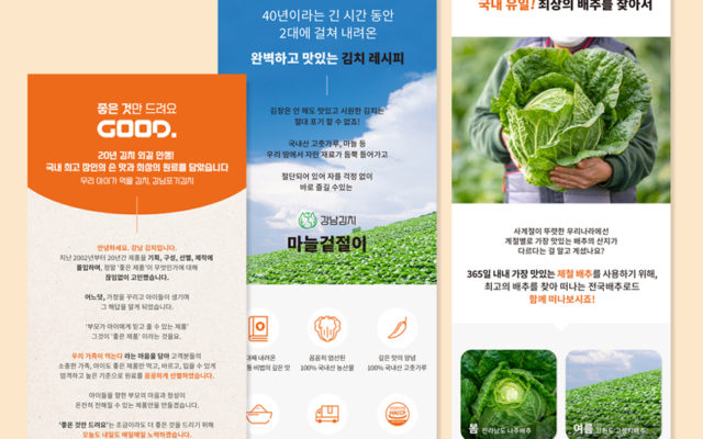 김치에 대한 설명이 담긴 상세페이이다. 오렌지 컬러를 메인으로 전체적으로 따뜻한 느낌이 들도록 제작했으며, 아이콘과 중간에 삽입된 강남김치 제작기가 담긴 일러스트 웹툰으로 시선을 사로잡는 디자인이다.