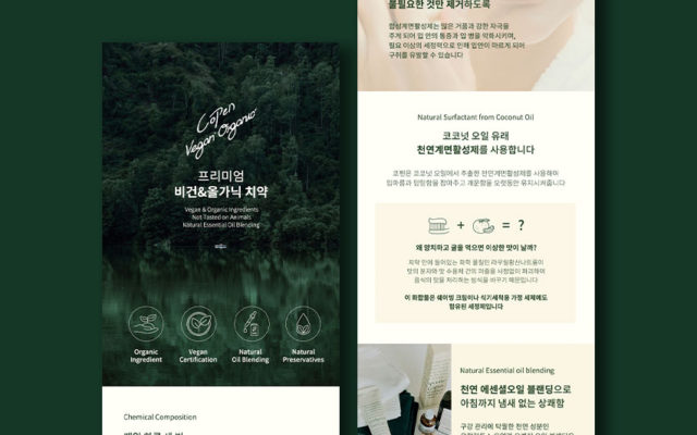 오가닉한 분위기로 제작한 상세페이지이다. 색상은 그린, 베이지 톤으로 깔끔하고 편안한 느낌을 주며 깔끔한 레이아웃으로 브랜드의 신뢰감을 줄 수 있도록 제작하였다.