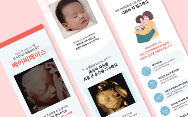 베이비 페이스 서비스 설명이 담긴 상세페이지로 기획부터 디자인까지 맡아 진행했다. 파스텔 톤을 사용해 따뜻하고 아기자기한 느낌을 더했으며, 적절한 이미지 사용으로 전문성 또한 도드라지게 제작했다.