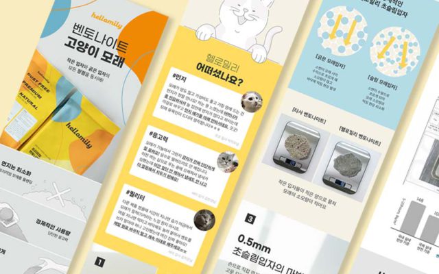 고양이 모래 상세페이지로 톤 다운된 일러스트와 이미지를 사용하여 귀여움보다는 전문성이 도드라지게 제작하였다.