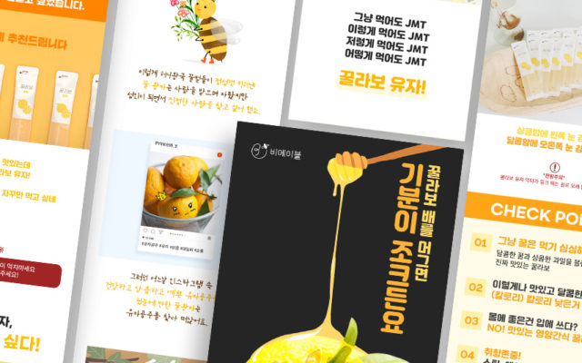 간편하게 섭취할 수 있는 스틱 꿀을 판매하는 브랜드로, 오렌지 옐로우 컬러를 사용하여 맛 별로 상큼하고 달달