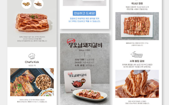 30년 전통이 담긴 돼지갈비 상세페이지로, 고급스럽게 하되 심플하고 깔끔하게 제작했다. 손그림 느낌의 아이콘으로 포인트를 주었다.