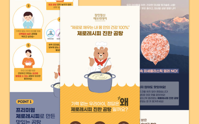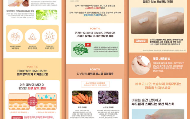 패키지에 들어가 있는 일러스트를 배치하여 눈으로 보기 즐겁고 통통 튀는 레이아웃을 통해 한눈에 들어오는 상세페이지이다.