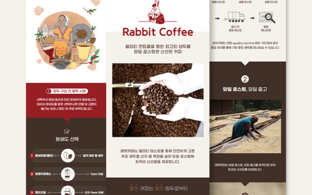 커피 색상과 어울리는 브라운 색상으로 전체적인 컬러감을 세련된 분위기로 연출하였으며 레이아웃과 디자인적 요소를 읽기 쉽고 깔끔하게 나타낸 상세 페이지이다.