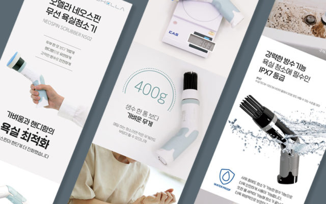 무선 청소기 브랜드로 제품 컬러와 맞게 한 컬러톤으로 깔끔하게 제작되었으며, 다양한 GIF(움짤)과 제품의 특장점을 알맞게 배치하여 제품의 이해도를 높였다.