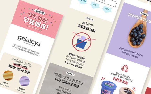 젤라또 아이스크림 상세페이지이다. 같은 톤온톤으로 하되 포인트 컬러를 조금씩 넣어 눈에 띄고 강조 될