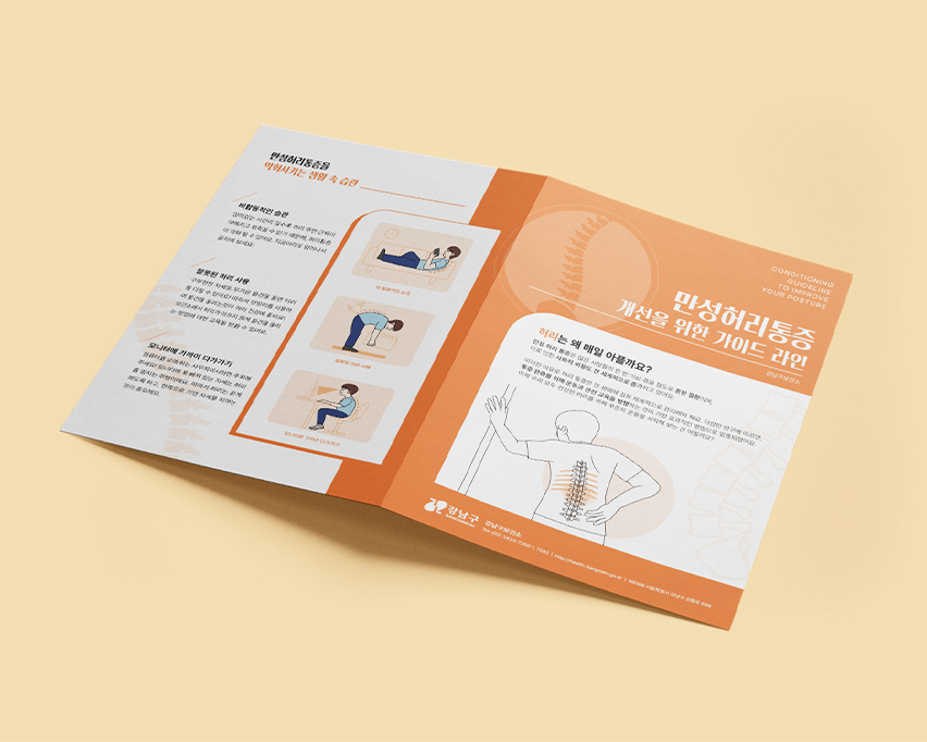 강남구보건소 만성허리통증 허리통증 개선을 위한 가이드 리플렛 디자인입니다. 직관적인 일러스트로 친근하면서 정보를 쉽게 전달하는 리플렛으로 제작했습니다. Date: June 10, 2025 Services: LEAFLET