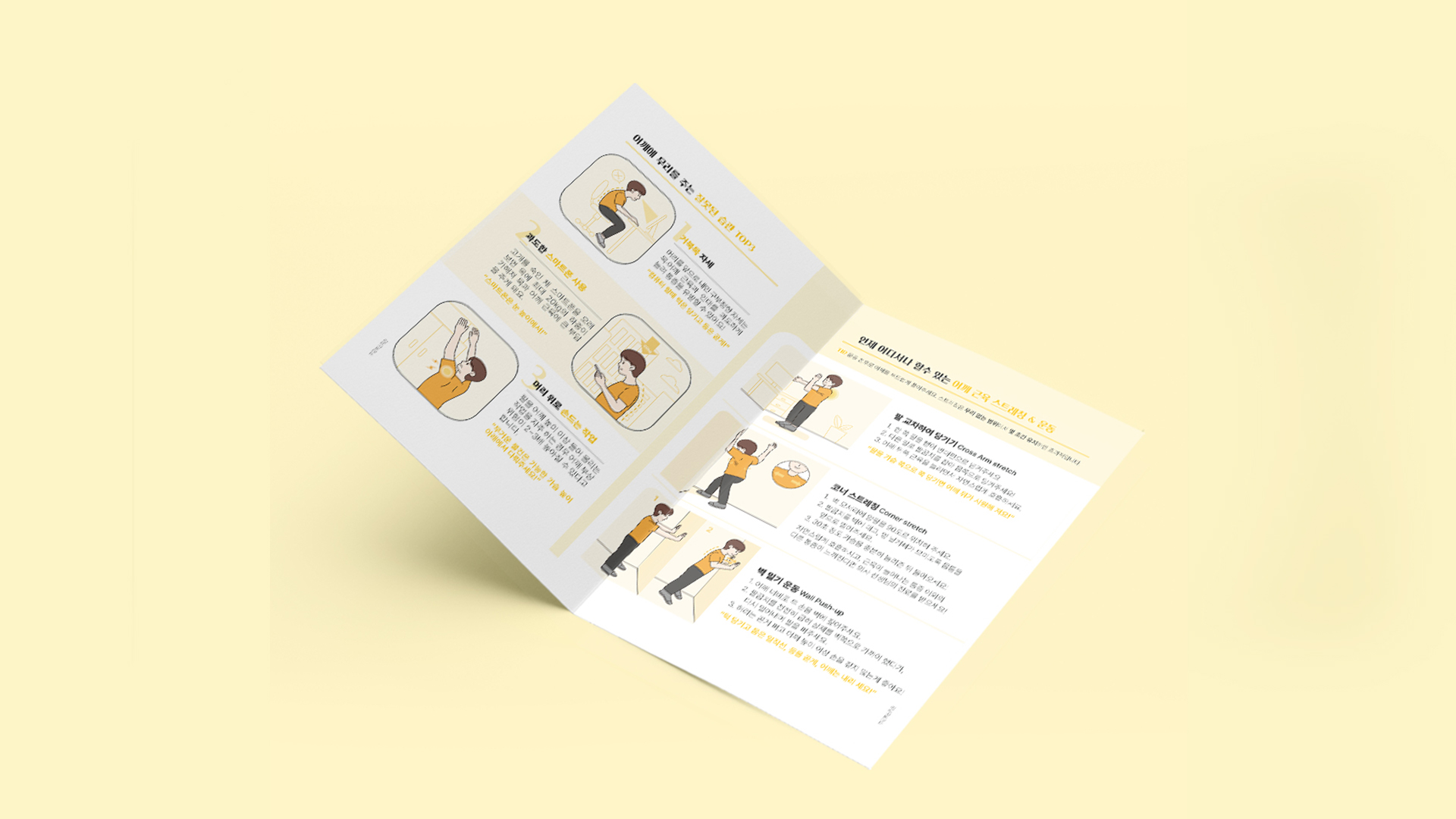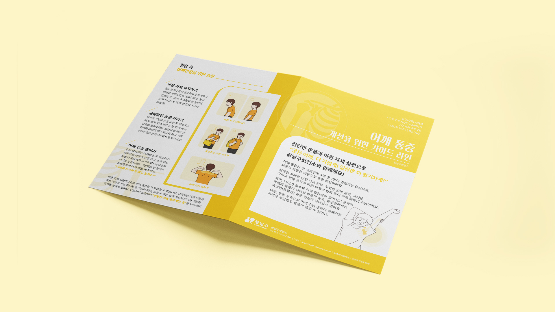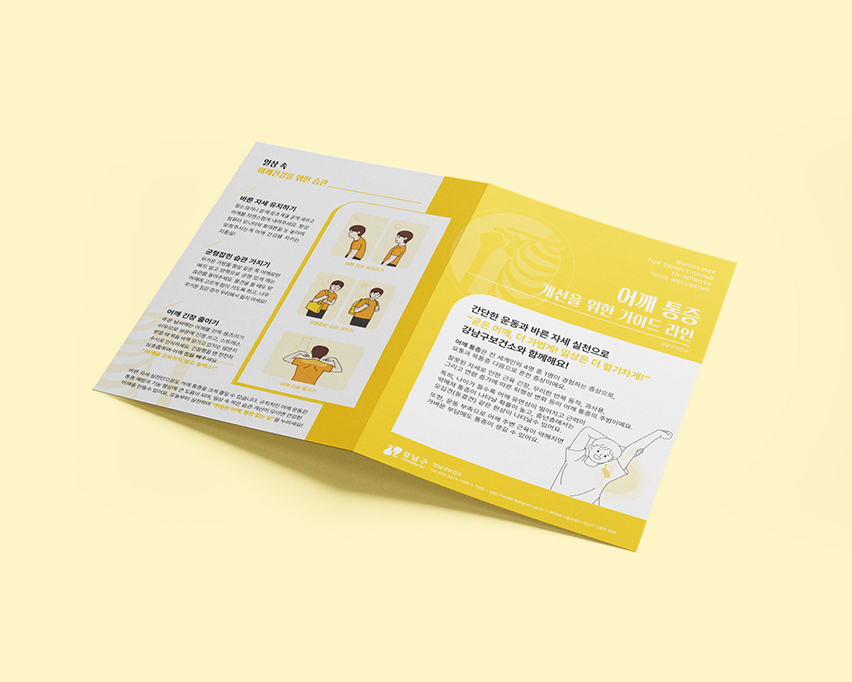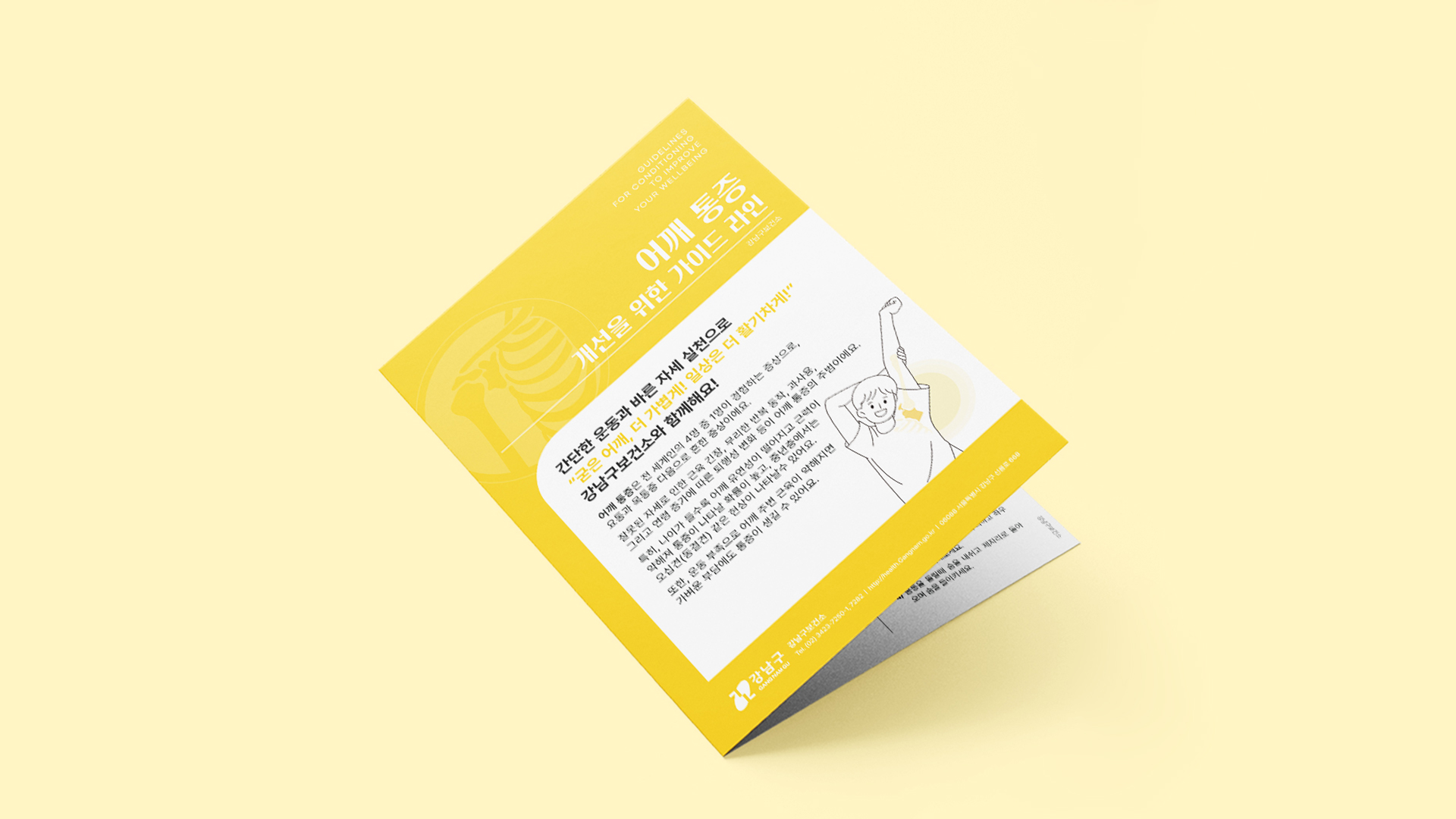 강남구보건소 어깨근골격계 어깨 통증 개선을 위한 가이드 리플렛을 제작했습니다. 친근한 일러스트를 활용해 정보를 직관적으로 전달하도록 구성했습니다. Date: May 5, 2025 Services: LEAFLET