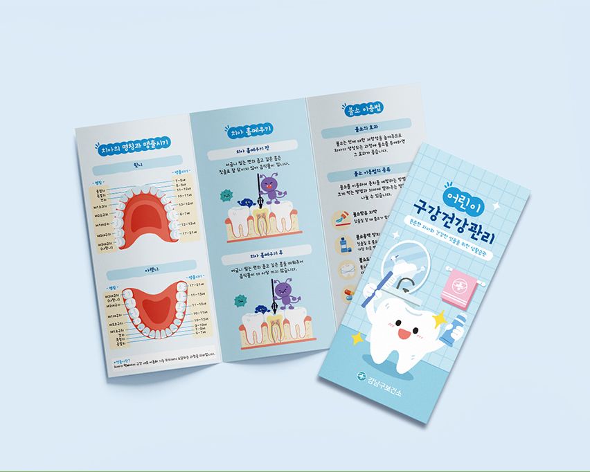 강남구보건소 어린이구강건강리플렛 아이들의 눈높이에 맞춰 귀엽고 친근한 이미지로 구성한 어린이 구강건강 리플렛 디자인입니다. Date: April 17, 2025 Services: LEAFLET