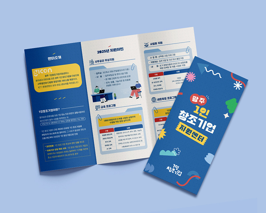 광주정보문화산업진흥원 광주의 1인기업과 중장년기업 지원 내용을 담은 리플렛입니다. 다양한 도형 요소를 활용하여 개성있는 리플렛으로 제작했습니다. Date: September 1, 2025 Services: LEAFLET