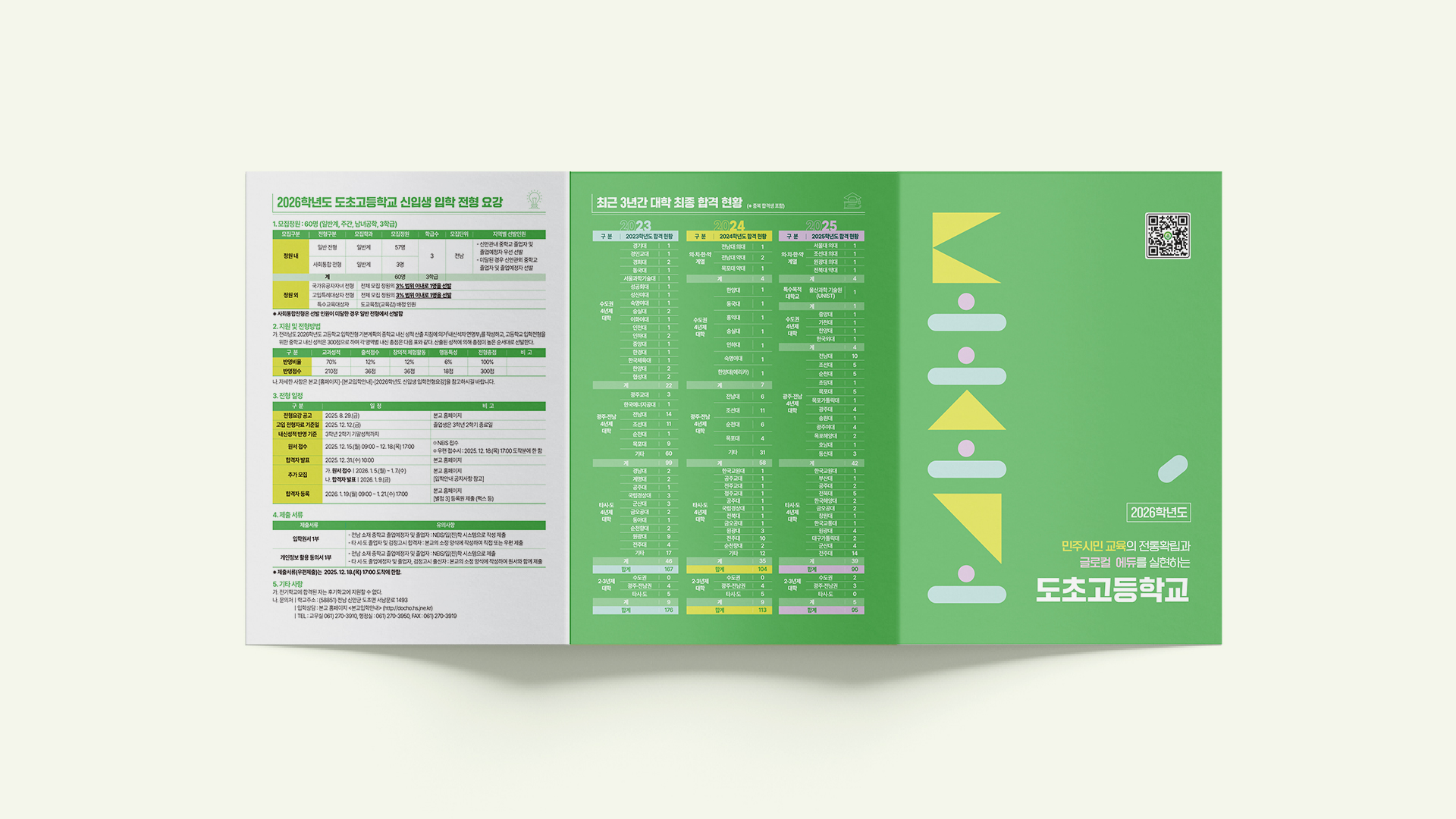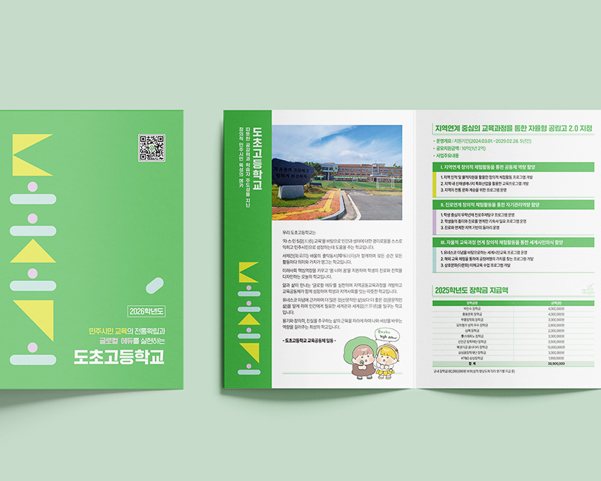 도초고등학교 도초고등학교 교육과정을 담은 안내 리플렛 디자인입니다. 초록색을 주색으로 사용하여 신뢰감과 친환경적인 이미지를 강조하였으며, 많은 정보를 쉽게 전달하기 위해 깔끔한 레이아웃으로 정리하여 가독성을 높였습니다. Date: December 18, 2025 Services: LEAFLET