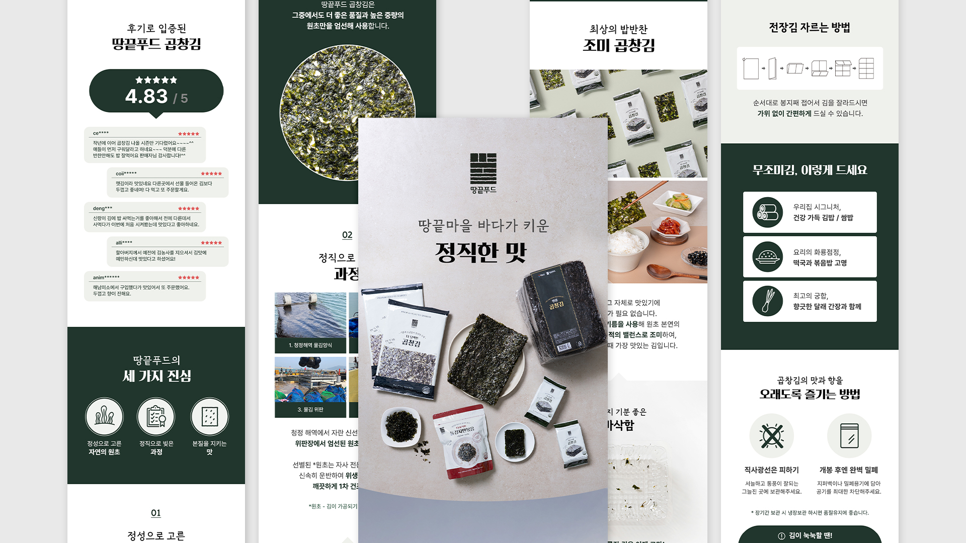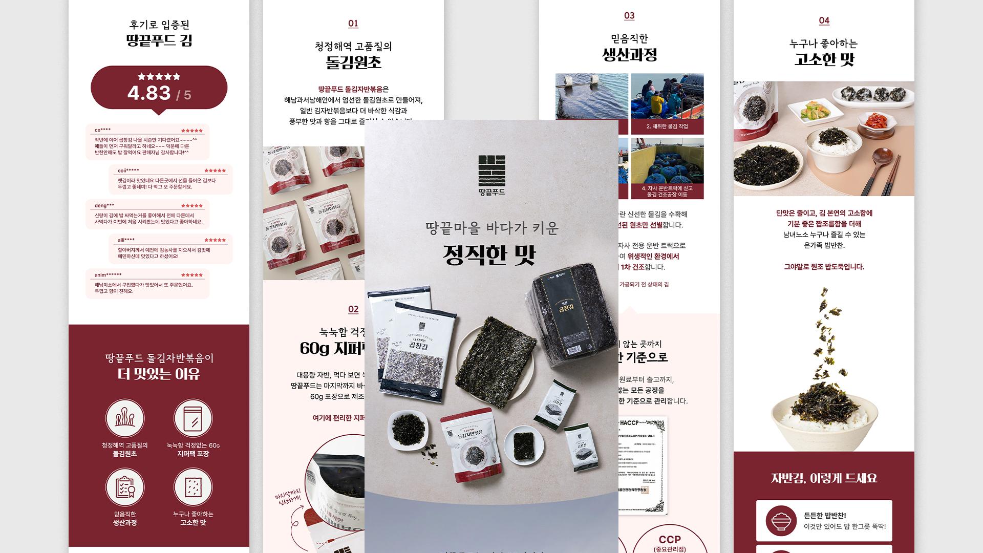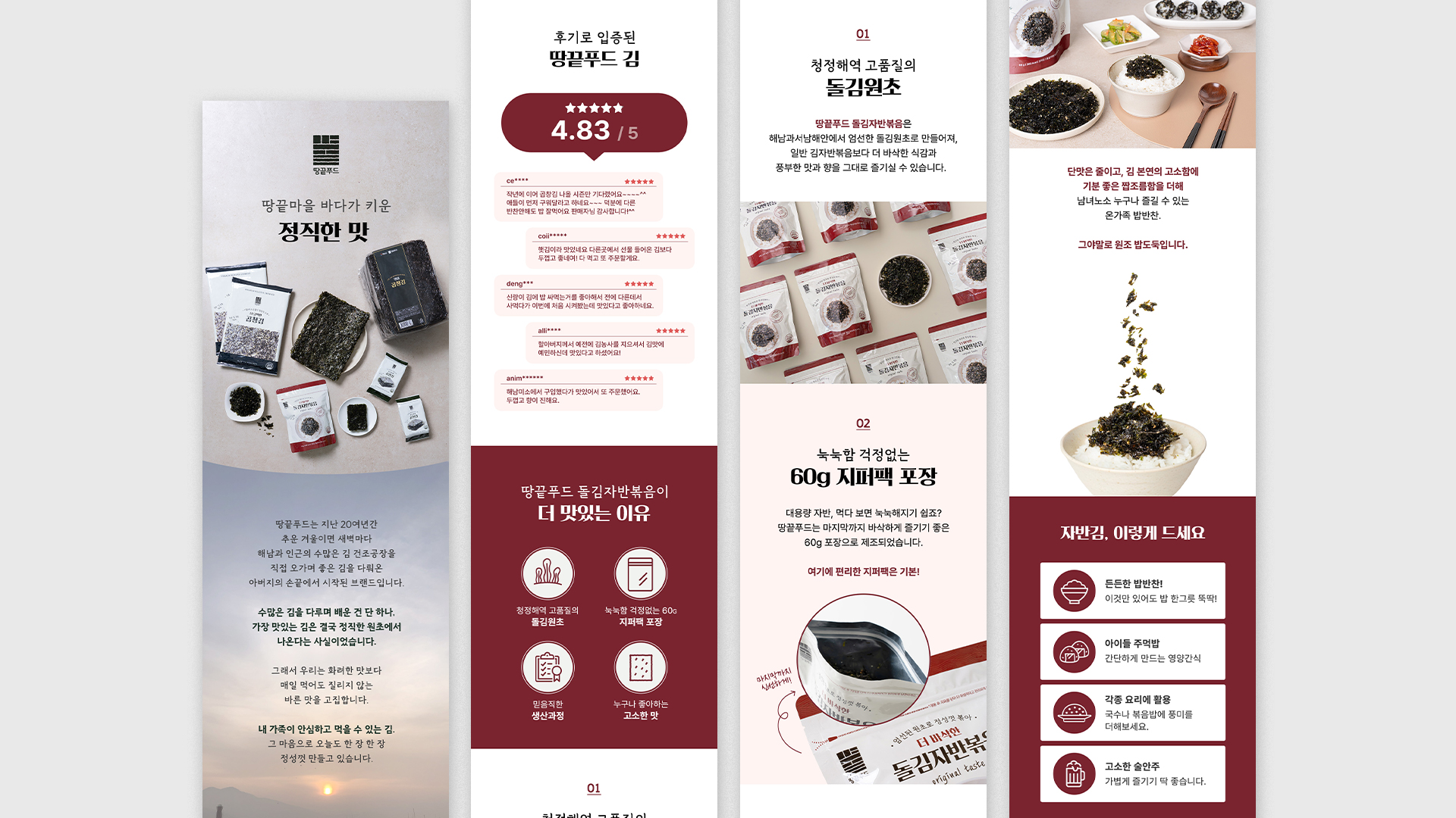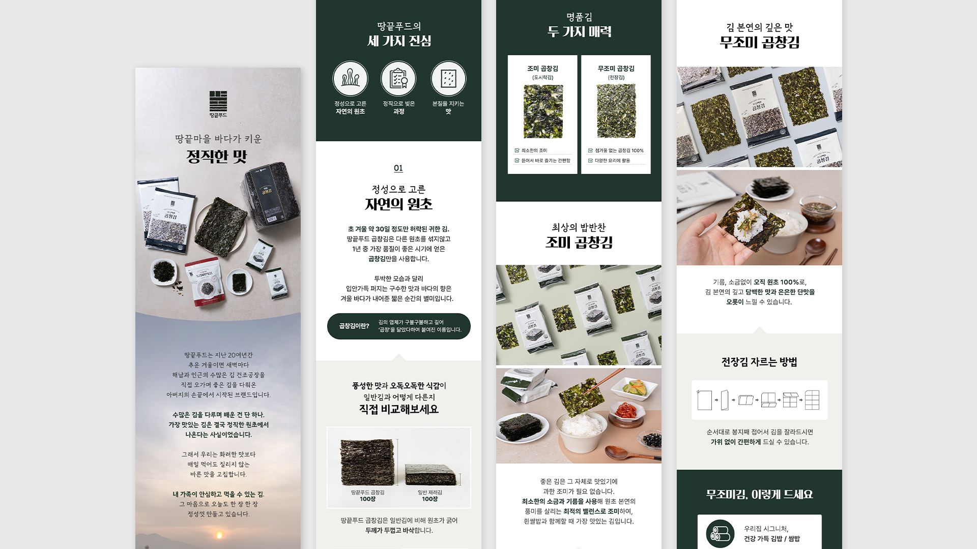 땅끝푸드 정갈한 여백의 미를 활용한 레이아웃을 통해 친환경적이고 깨끗한 브랜드 이미지를 부각시키고 고감도 제품 사진과 신뢰감 있는 생산 공정 과정을 체계적으로 구성하여 제품의 본질을 직관적으로 전달하고자 했습니다. 가독성 높은 타이포그래피로 브랜드의 진정성 있는 메시지를 효과적으로 담아냈습니다. Date: November 5, 2025 Services: DETAILED PAGE