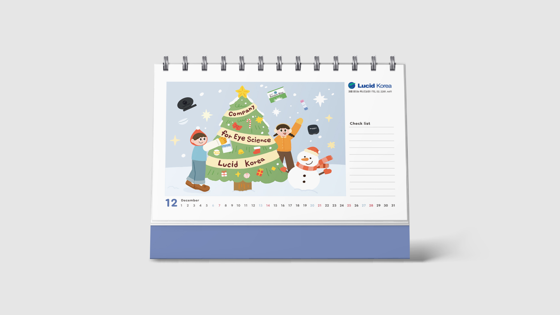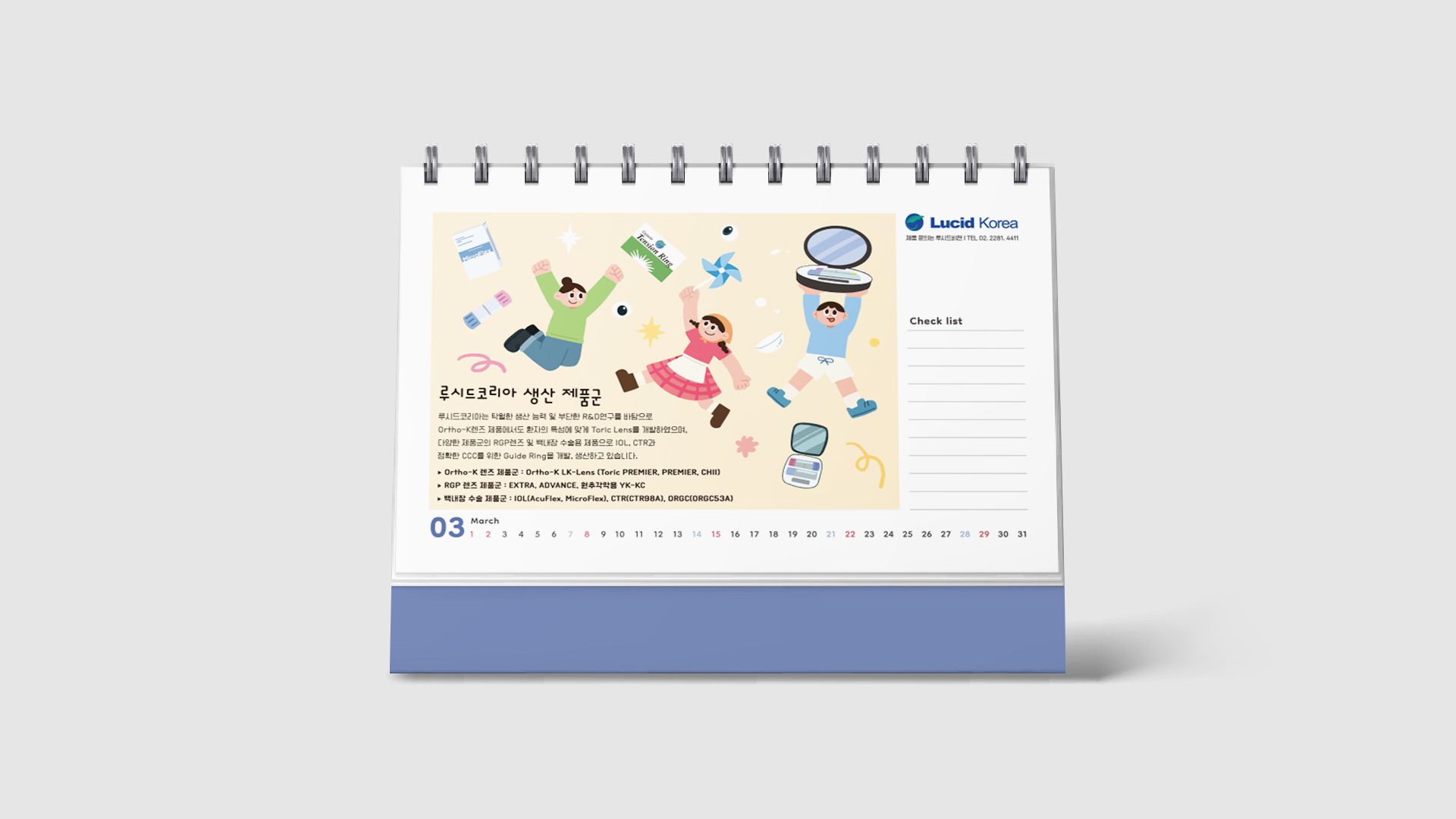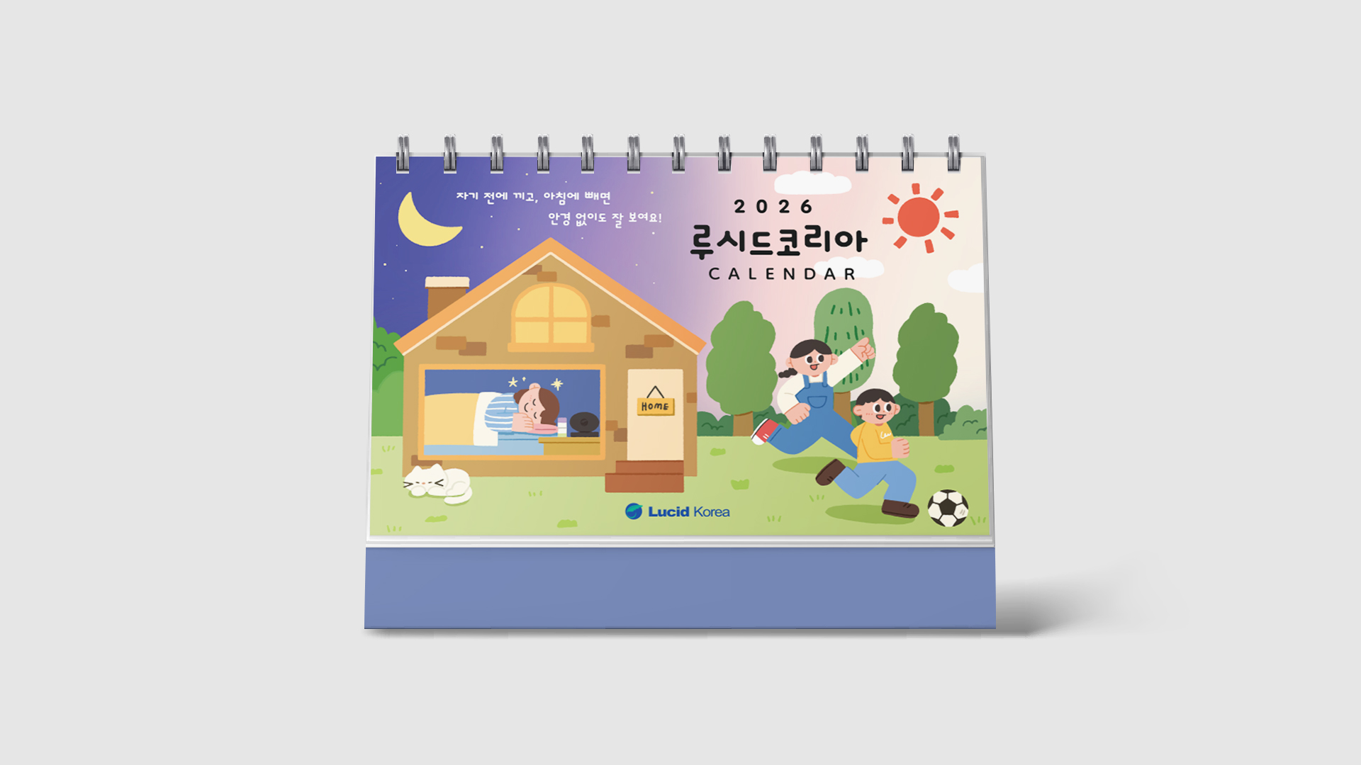 루시드코리아 브랜드 이미지를 친근하고 따뜻한 일러스트로 제작한 2026달력 디자인입니다.