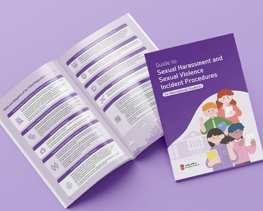 서강대학교 서강대학교 외국인을 위해 제작한 성평등 안내책자입니다. 보라색을 활용해 주제를 표현하고, 친근하고 따뜻한 일러스트로 제작했습니다. Date: June 11, 2025 Services: LEAFLET