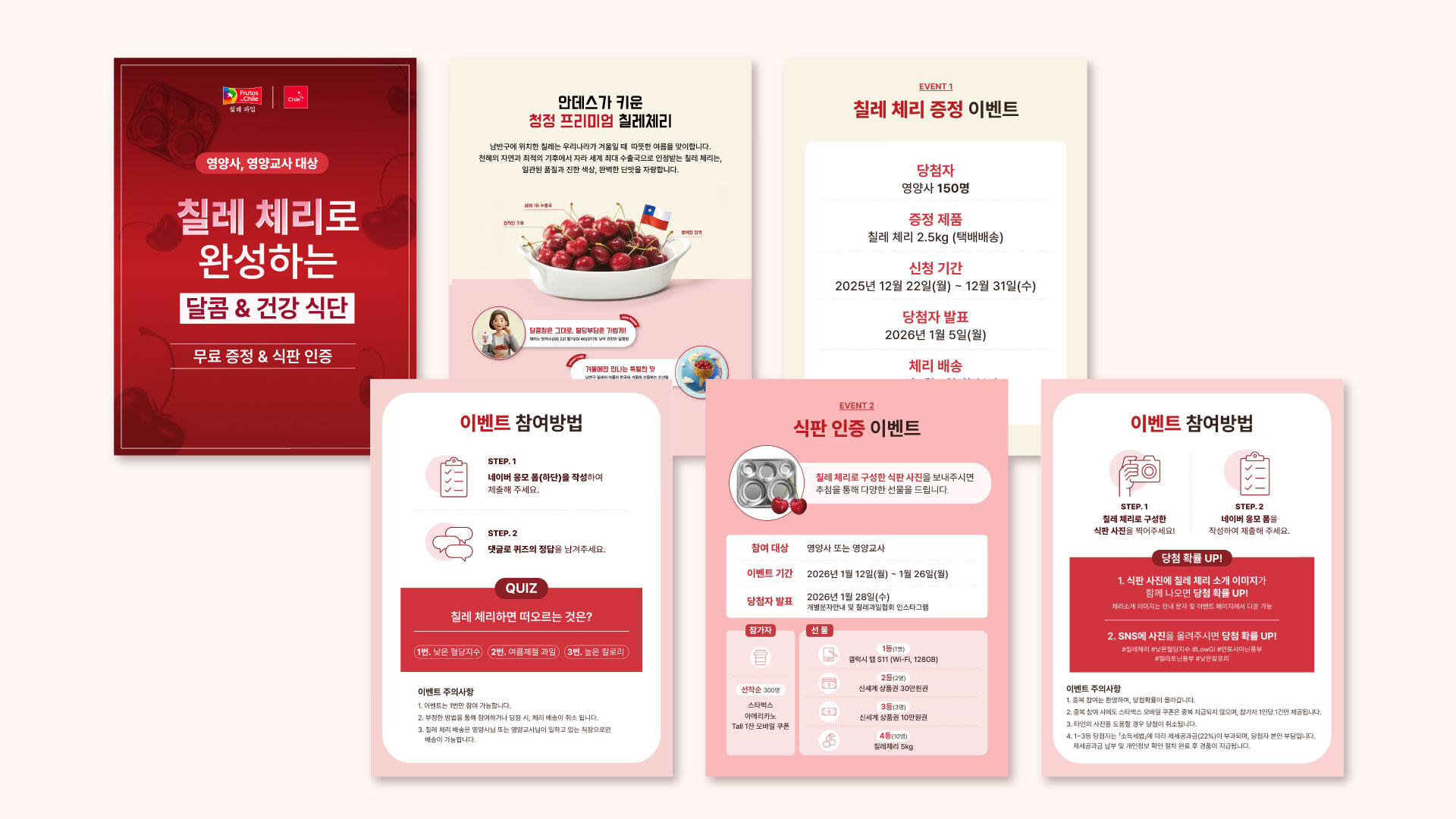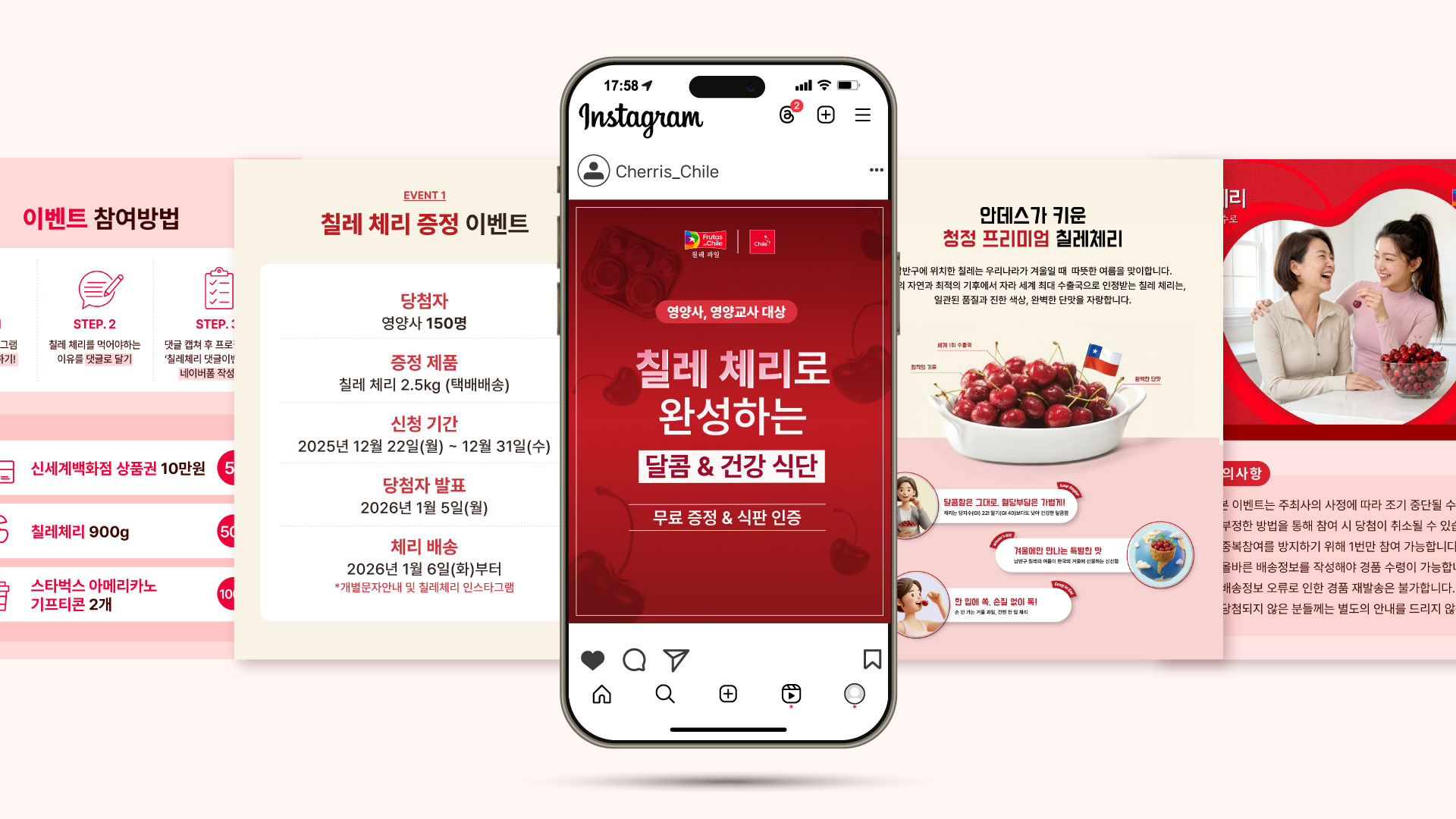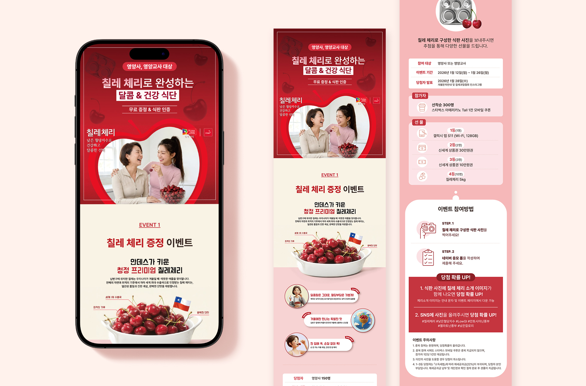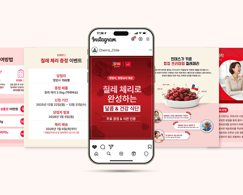 칠레 체리의 깊은 딥레드 컬러를 메인으로 활용해 제품의 신선함과 프리미엄 이미지를 강조하고,