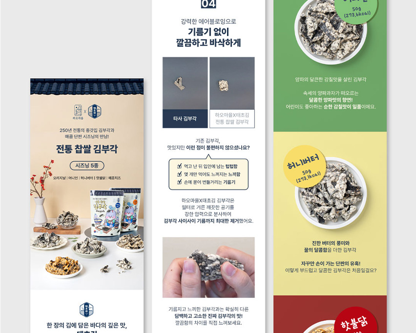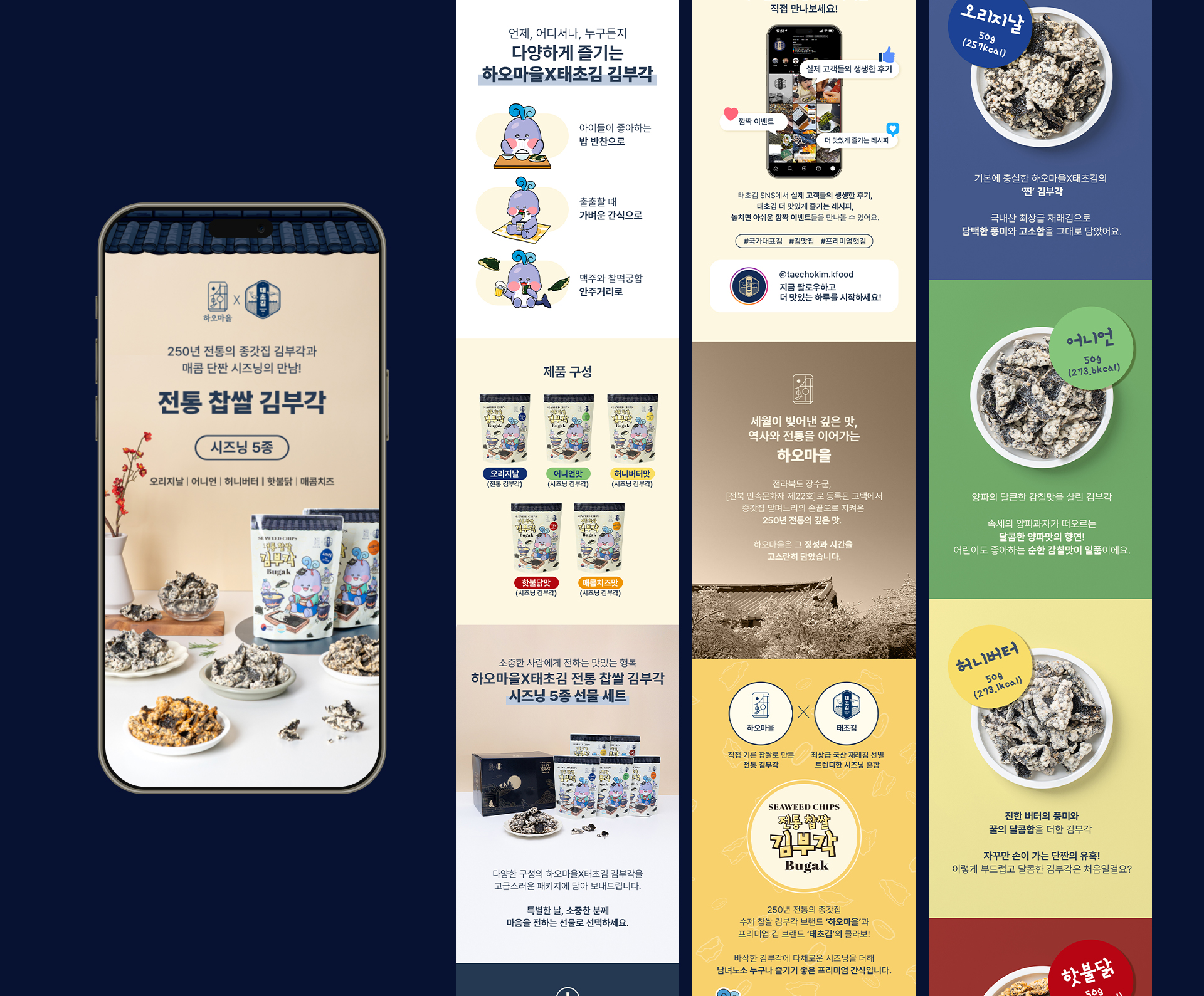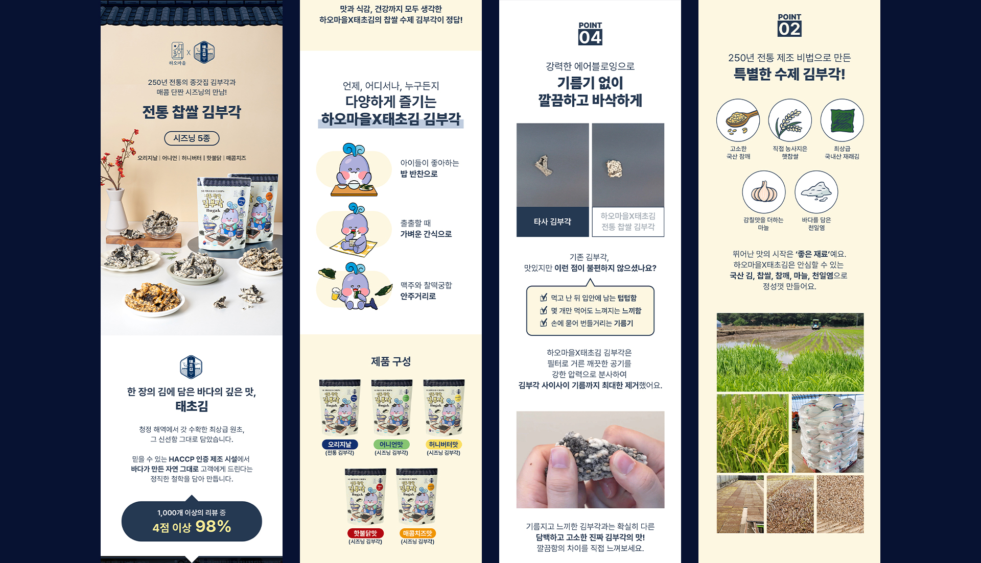 태초김X하오마을 한국적인 이미지를 활용하여 전통의 깊이를 강조하는 동시에, 마스코트 캐릭터와 일러스트를 적절하게 배치하여 친근함과 현대적인 매력을 더했습니다. 제품의 핵심 장점과 구체적인 정보를 명확하게 제시하여 소비자의 이해도를 높이고 신뢰를 구축하는 데 집중했습니다. Date: August 30, 2025 Services: PRODUCT DETAILS PAGE