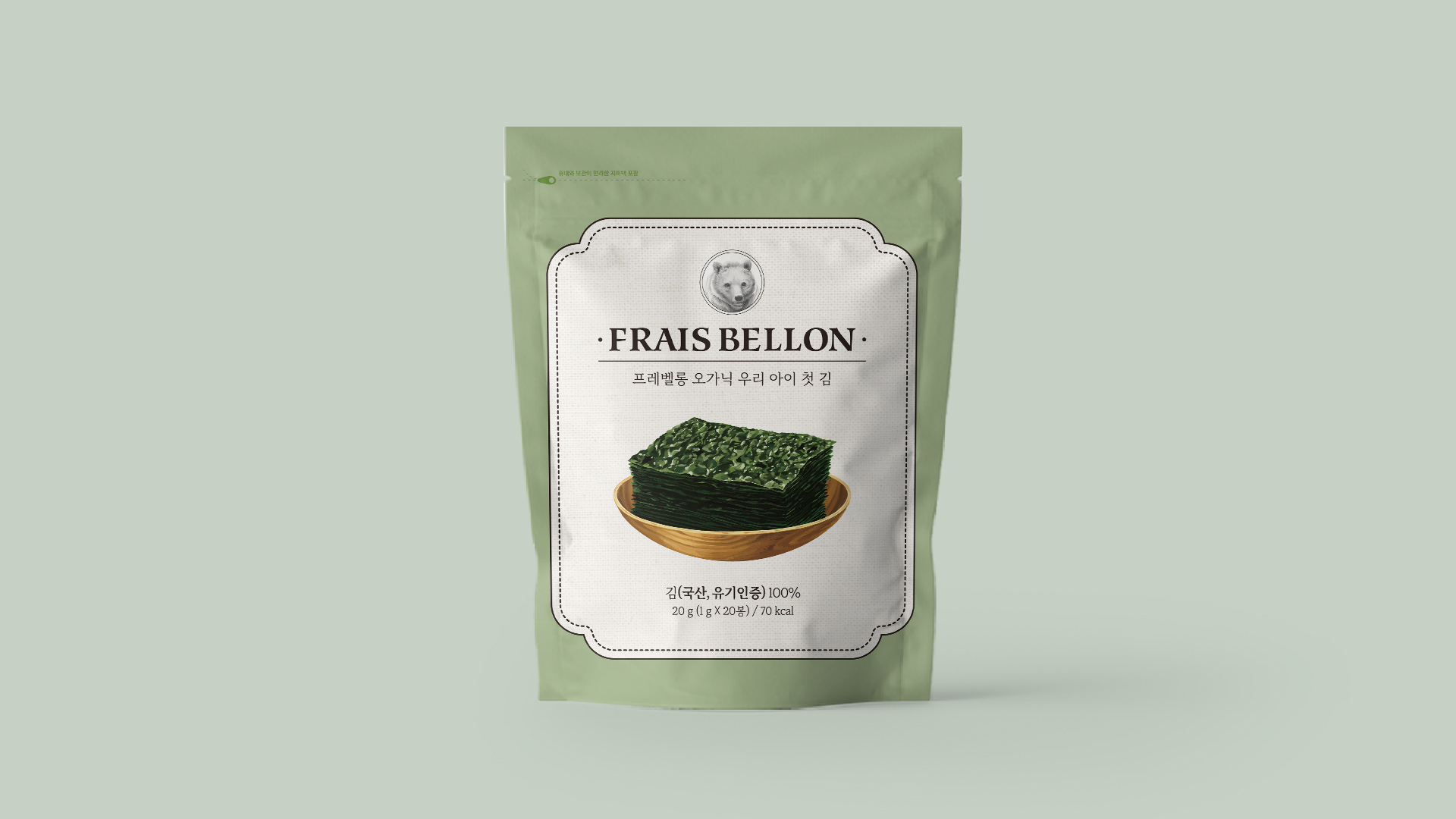 프레벨롱 프리미엄 유기농 브랜드 프레벨롱의 김 패키지 디자인입니다. 부드러운 그린 톤을 사용하여 자연 친화적이고 건강한 이미지를 전달합니다. Date: February 12, 2025 Services: PACKAGE
